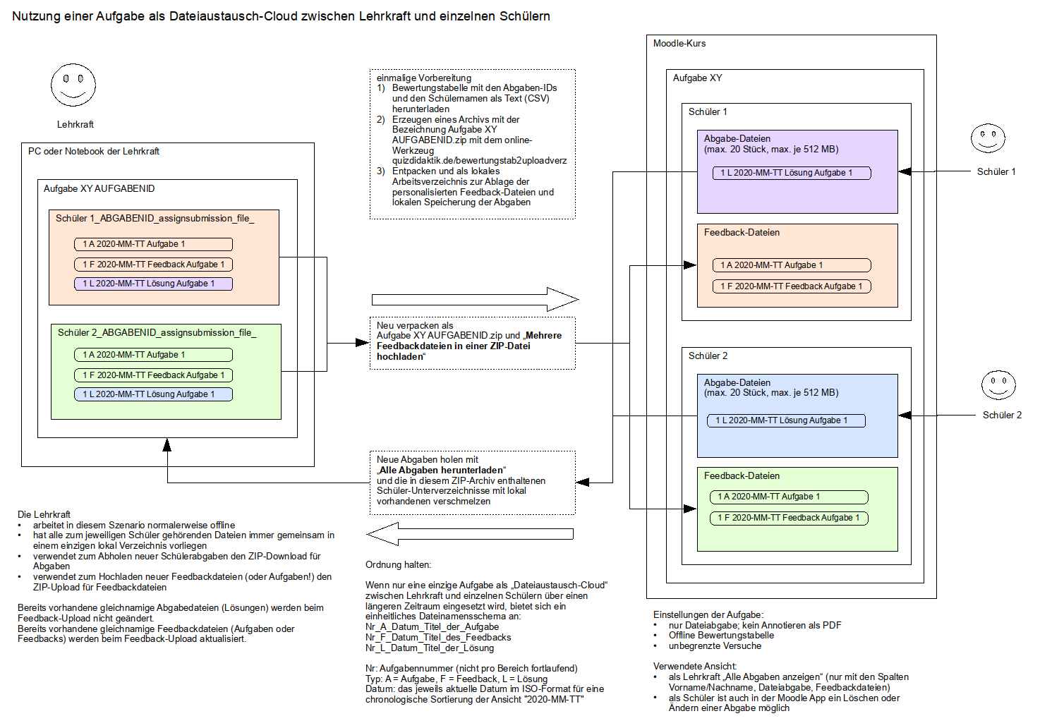 Die Lehrkraft verwaltet zunächst komplett offline alle Aufgabenstellungen, Lösungshinweise, Schülerlösungen und Feedbackdateien gesammelt in einem Verzeichnis pro Schüler.