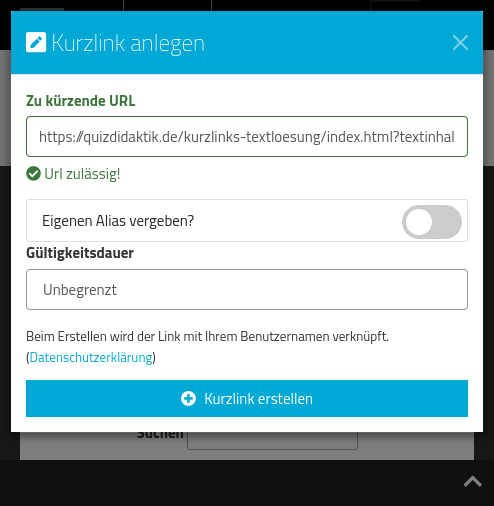 2. Kurzlink-Alias ggfs. bearbeiten und anlegen