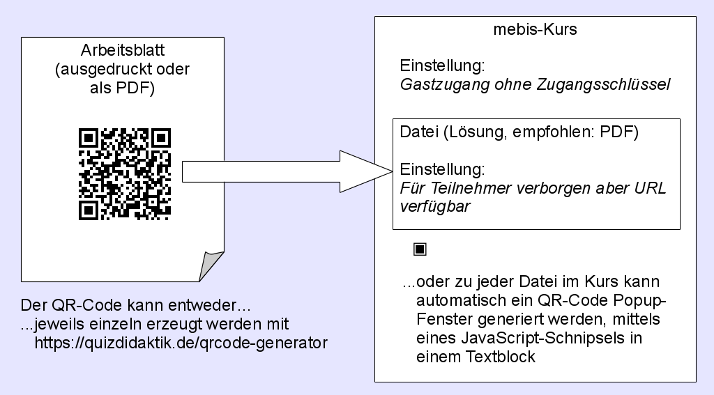 Zum Erzeugen der QR-Codes kann entweder einzeln der quizdidaktik.de/qrcode-generator genutzt werden ODER - viel einfacher - über einen JavaScript-Schnipsel in einem Textblock wird automatisch bei jeder Datei in Button eingefügt, über den man in einem Popup-Fenster den QR-Code für die betreffende Datei angezeigt bekommt. Diese Grafikdatei kann gespeichert und in das zugehörige Arbeitsblatt eingefügt werden.
