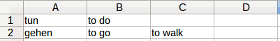 Schritt 1: Erstellen einer Vokabeltabelle in LibreOffice Calc mit den folgenden Spalten: