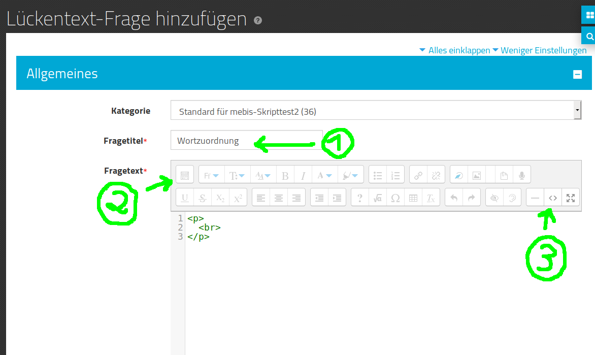 4 Fragentitel eingeben und in HTML-Bearbeitungsmodus wechseln (in mebis)