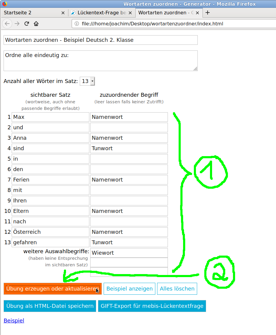 5 Übung erzeugen oder aktualisieren (im Wortartenzuordner auf Quizdidaktik)