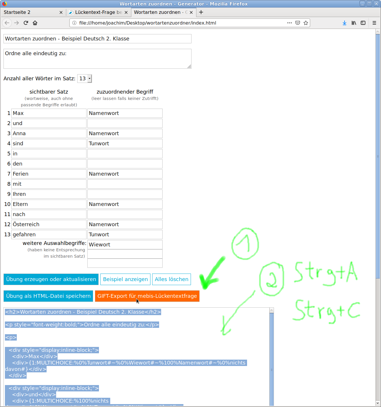 6 GIFT-Export für mebis und Fragenquelltext kopieren (im Wortartenzuordner auf Quizdidaktik)